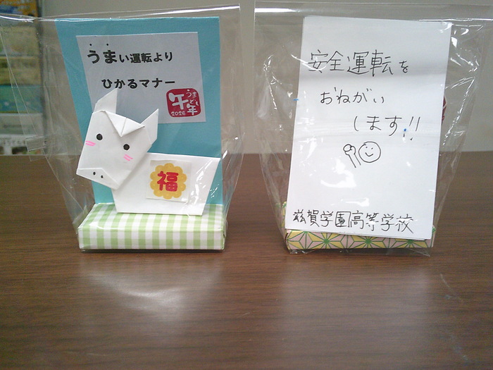 滋賀学園高等学校ソフトボール部員が手作りした交通安全啓発品を配布します。
